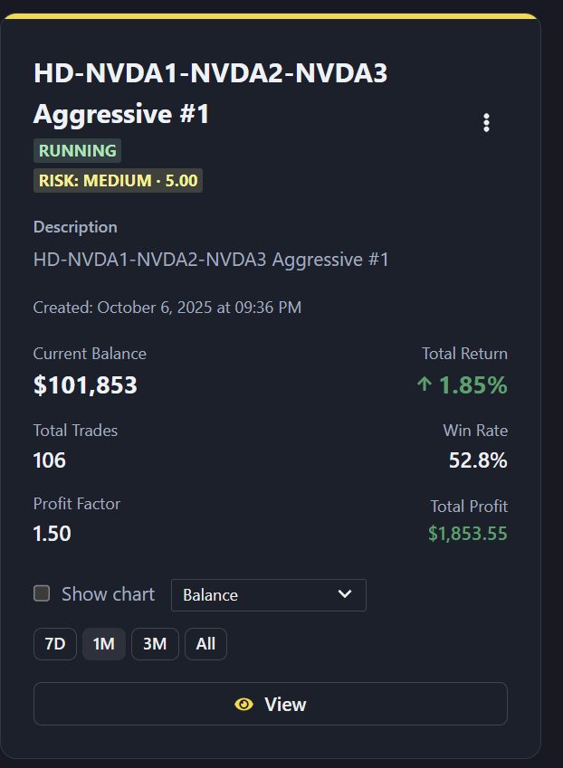 You can create your own or explore ours—all forward-tested on live data, never on cherry-picked backtests.