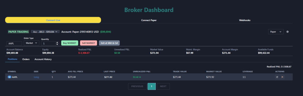 Deploy your tested strategies from paper trading to live markets with one click. Full transparency on execution prices, slippage, and trade confirmations.